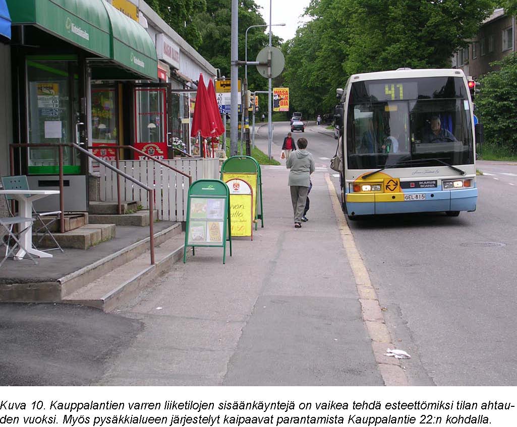 Inva-paikoilta ei pääse jalankulkuväylälle ja reunakivi on liian korkea. Luiskalle mentäessä joutuu kiertämään pitkän matkan. Bussipysäkin tolppaa on vaikea erottaa, koska se on sijoitettu etäälle ajoradan reunasta. Bussipysäkkialue tulisi merkitä tunto- ja kontrastivärivyöhykkeellä.