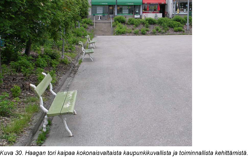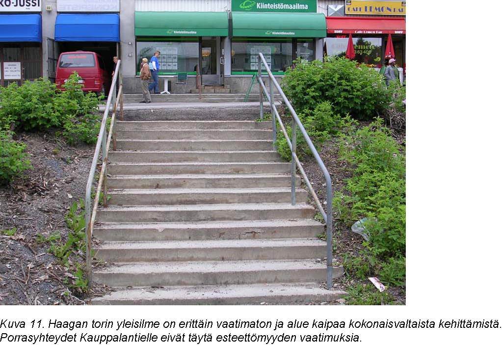 Haagan torin alue kaipaa merkittävää toiminnallisuuden ja viihtyisyyden kehittämistä kokonaisuutena. Vaikeasti poistettava ongelma on korkeuserojen ja portaiden poistaminen kaupallisten palvelujen sisäänkäynneistä. Kauppalantien ja Kylänevantien risteyksen suojateiden keskisaarekkeet ovat erittäin kapeat ja suojateiden reunakivien tulisi olla esteettömiä. Pysäkkialueiden osalta tulisi tarkastella mahdollisuutta korottaa pysäkkien reunakiveä, jotta ajoneuvoon nouseminen helpottuisi. Katoksen tarve olisi myös kadun länsipuolella.