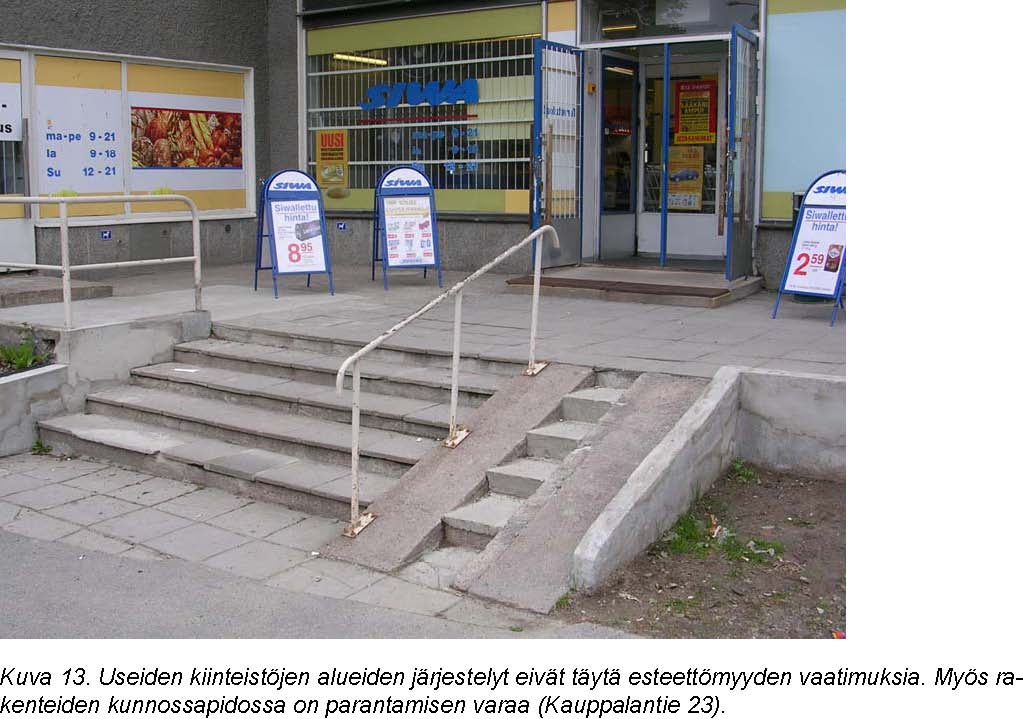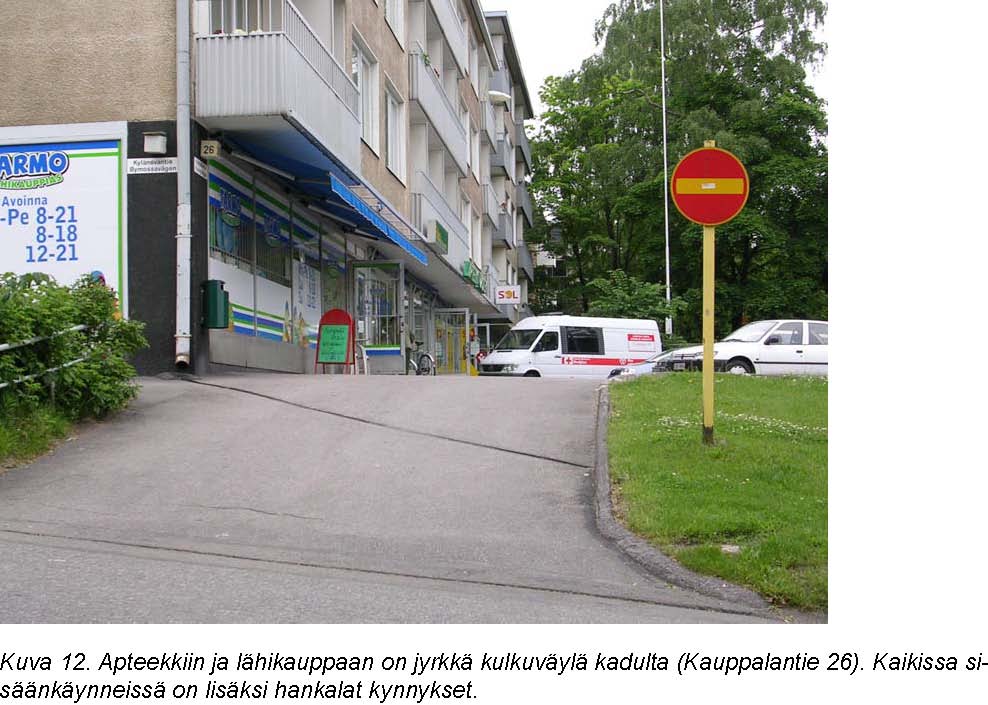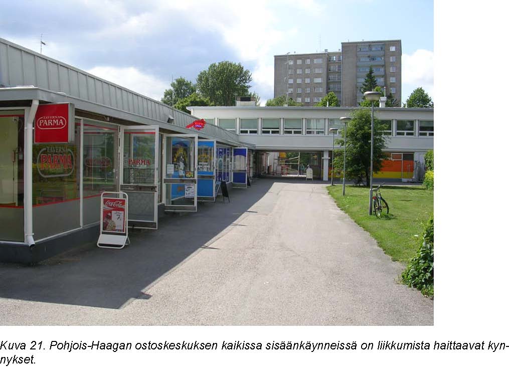 Pohjois-Haagan vanhan ostoskeskuksen sisääntuloalueella liikkumista haittaavat ajoneuvo-ja pysäköintiliikenteen ja jalankulun järjestelyiden selkiytymättömyys. Järjestelyjä pitäisi kehittää erityisesti kiinteistön alueella. Ostoskeskuksen liikkeiden sisäänkäyntien ongelmana ovat kynnykset.
