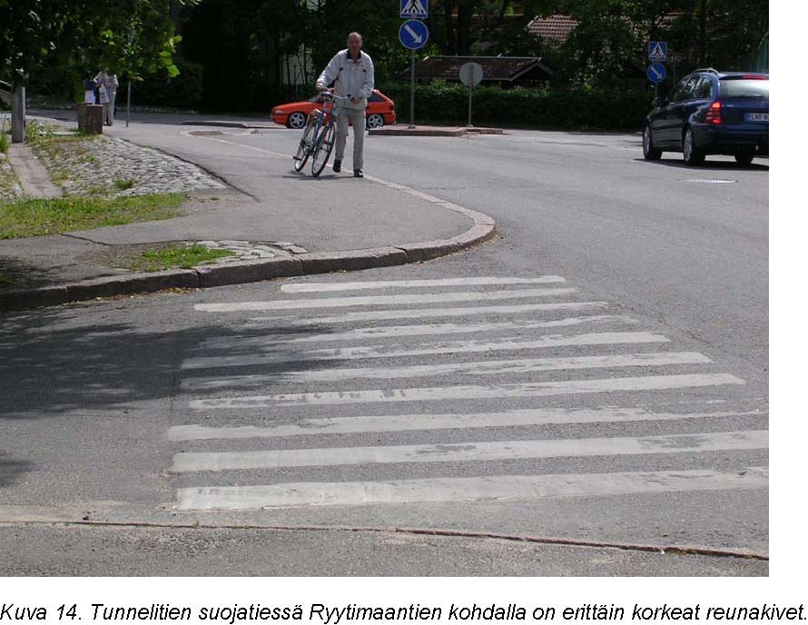 Tunnelitien suojatiessä Ryytimaantien kohdalla on erittäin korkeat reunakivet, joiden ylittäminen rollaattorilla tai pyörätuolilla on erittäin hankalaa. Suojatien läheisyydessä, jalkakäytävän reunassa on kulkupintaa alempana sijaitseva kaivonkansi, jonka murtunut ja jyrkkäreunainen ympäristö aiheuttaa kompastumisvaaran.