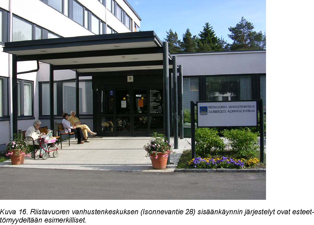 Hyvä esimerkki esteettömyyden järjestämisestä Etelä-Haagan alueella on Riistavuoren vanhustenkeskuksen sisäänkäynnin järjestelyt. Katettu laaja sisäänkäyntialue käsi- ja selkänojallisine penkkeineen, esteettömät ja karkeat kulkuväylät, selkeästi järjestetty opastus ja automaattiovet muodostavat esimerkillisen kokonaisuuden. Myös voimakkaiden kontrastien käyttö lisää liikkumisen turvallisuutta ja vähentää törmäysriskiä.