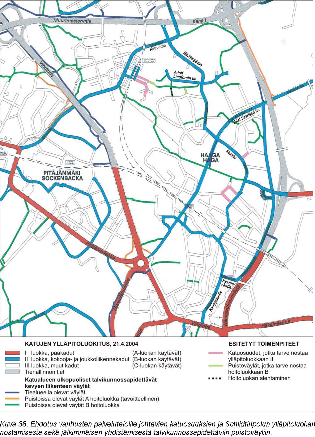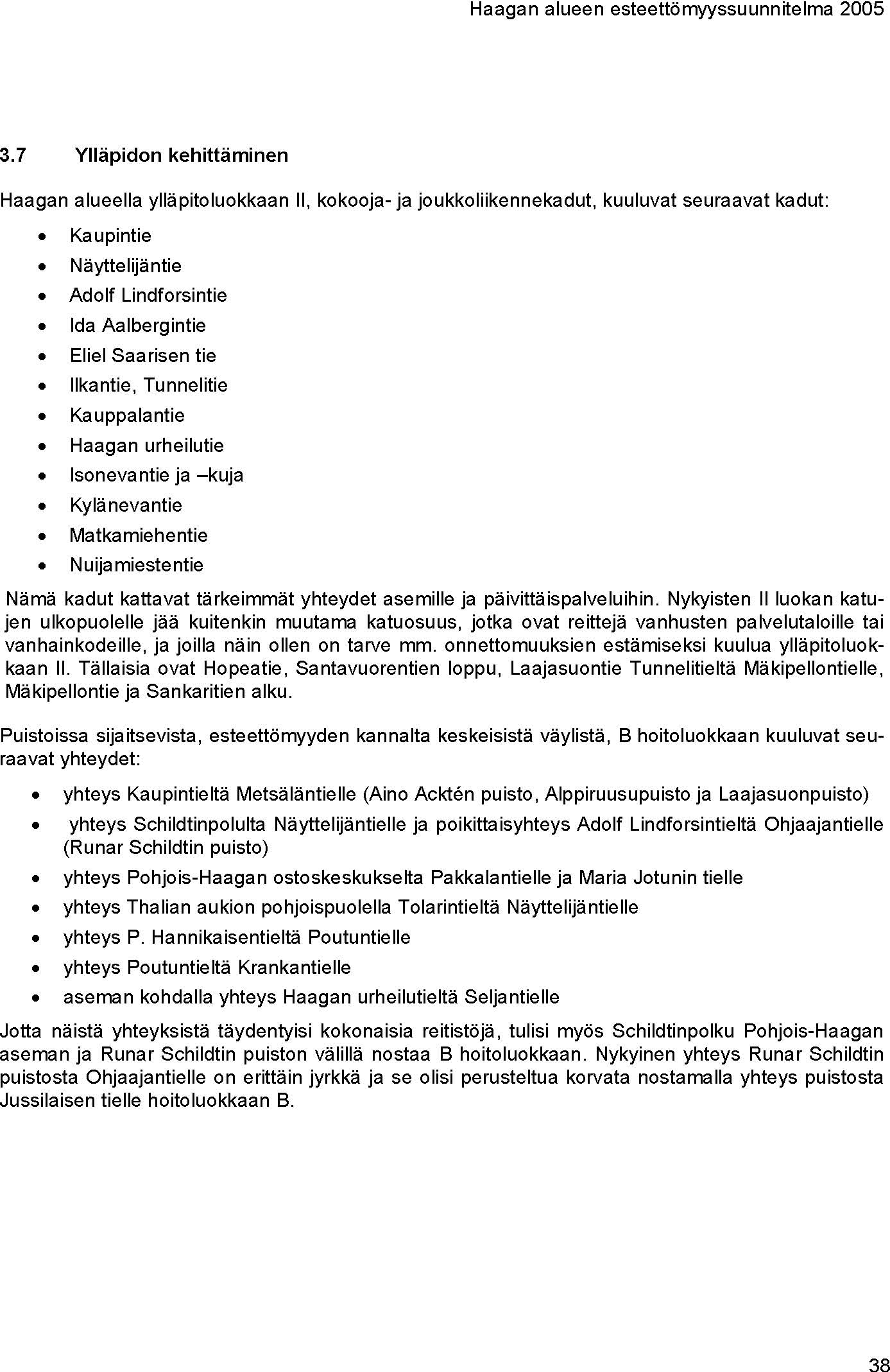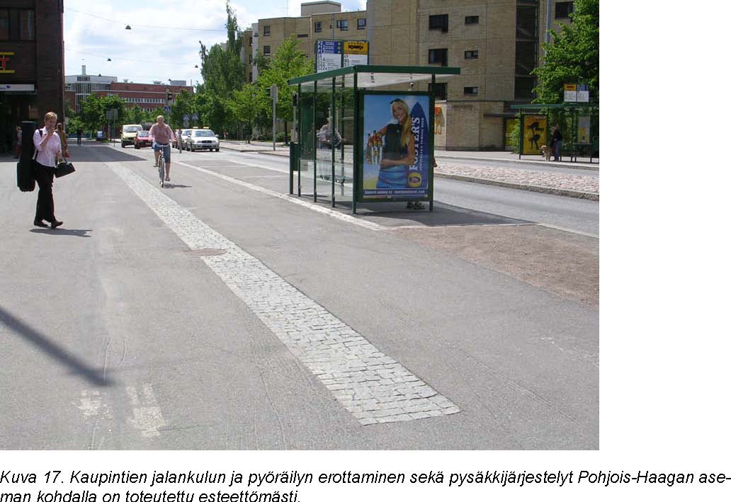 Reitit vanhusten palvelutaloilta (Sankaritie, Kauppalantie) Haagan torille ja sitä reunustaviin yksityisiin palveluihin, kuten lähikauppa ja apteekki, muodostavat erikoistason esteettömyyttä vaativan alueen. Kaikkia tälle alueelle esitettyjä kunnossapidon ja kehittämistoimenpiteitä tulisi pitää kiireellisesti toteutettavina.