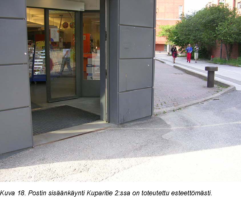 Eteläpuolen ulko-ovien päällä oleva opaste on riittävän suuri. Käsijohde ohjaa ovelle. Lähin bussipysäkki on vaikea löytää. Pysäkkialueen voisi korostaa jollakin laattaratkaisulla. Samalla voitaisiin merkitä kontrastimateriaalilla sekä polkupyörien säilytys alue ja ovien molemmille puolille jäävät ”kulmat” varoittavalla materiaalilla. Pohjoispuolen ovet ovat selkeässä syvennyksessä, joten niiden löytäminen seinästä on helppoa. Lisäksi oville johtaa käsijohde. Ovien molemmilla puolilla on ”kulmat”, jotka tulisi merkitä varoittavalla materiaalilla.