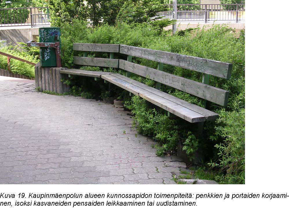 Kaupinmäenpolku aseman ja alikulun välisellä osalla tarvitsee monenlaisia kunnossapidon toimenpiteitä: ylikasvaneet pensaat pitää leikata tai uudistaa, rikkinäiset penkit ja portaat pitää korjata. Kunnossapidon kokonaisuutta suunniteltaessa tulee arvioida myös esteettömyyden parantamisen mahdollisuudet esimerkiksi porrasaskelmien reunan merkitsemisen tai esteettömien käsijohteiden osalta.