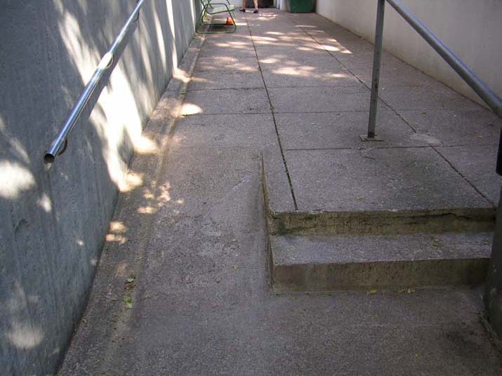 Kuva 1. Sankaritie 1:ssä sijaitsevan Bertahemmetin vanhusten palvelutalon pihaan johtava käytävä ja sisäänkäyntien luiskat ja portaat eivät täytä esteettömyyden vaatimuksia.