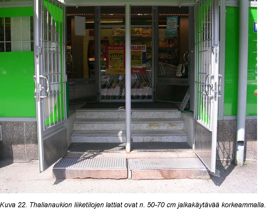 Thalianaukio on erittäin vaikeasti esteettömäksi parannettava alue. Lähes kaikkien liiketilojen aukion laidalla lattia on rakennettu n. 50-70 cm aukiota ylemmäksi. Tästä johtuen sisäänkäynneissä on useita porrasaskelmia sekä rakennusten sisällä että ulkopuolella. Aukiota kiertää pysäköintialue, joka täytyy ylittää, jos haluaa siirtyä jalkakäytävältä aukion keskustan istutusalueelle. Leveät, turvattoman tuntuiset ylitykset vähentävät aukion keskialueen vetovoimaisuutta. Aukio kaipaa toiminnallista ja ympäristöllistä kehittämistä kokonaisuutena.