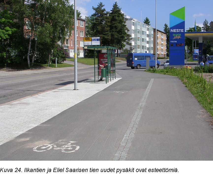Eliel Saarisen tien ja Ilkantien risteykseen on rakennettu uudet pysäkit, jotka ovat esteettömiä. Pysäkkien kohdalle on valmistumassa senioritalo ja Ilkantien eteläpuolelle on suunniteltu lisää vanhuksille tarkoitettua asumista. Myös pysäkkien kohtien suojatiet olisi perusteltua parantaa korkeatasoisiksi lisäämällä osalle suojatien leveyttä luiskattu reunakivi helpottamaan rollaattorilla ja pyörätuolilla liikkumista.