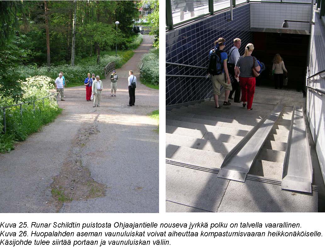 Asemalle saapuminen kävellen tapahtuu usein joko liian jyrkkien luiskien tai huonokontrastisten ja heikkokuntoisten portaitten kautta. Useimpien reittien käytettävyyttä huonontaa käsijohteiden puutteellisuus. Ne joko puuttuvat kokonaan tai loppuvat kesken. Tämän lisäksi useat käsijohteet ovat väärällä korkeudella. Käsijohteiden korkeuden vaihteluväli on 1220 mm:stä 840 mm:iin. Portaista puuttuvat kontrastiraidat. Vaunuluiskat portaikoissa ovat vaarallisia ja sen takia näkövammaista ohjaavia elementtejä tulisi käyttää opastamaan portaitten turvalliseen reunaan.