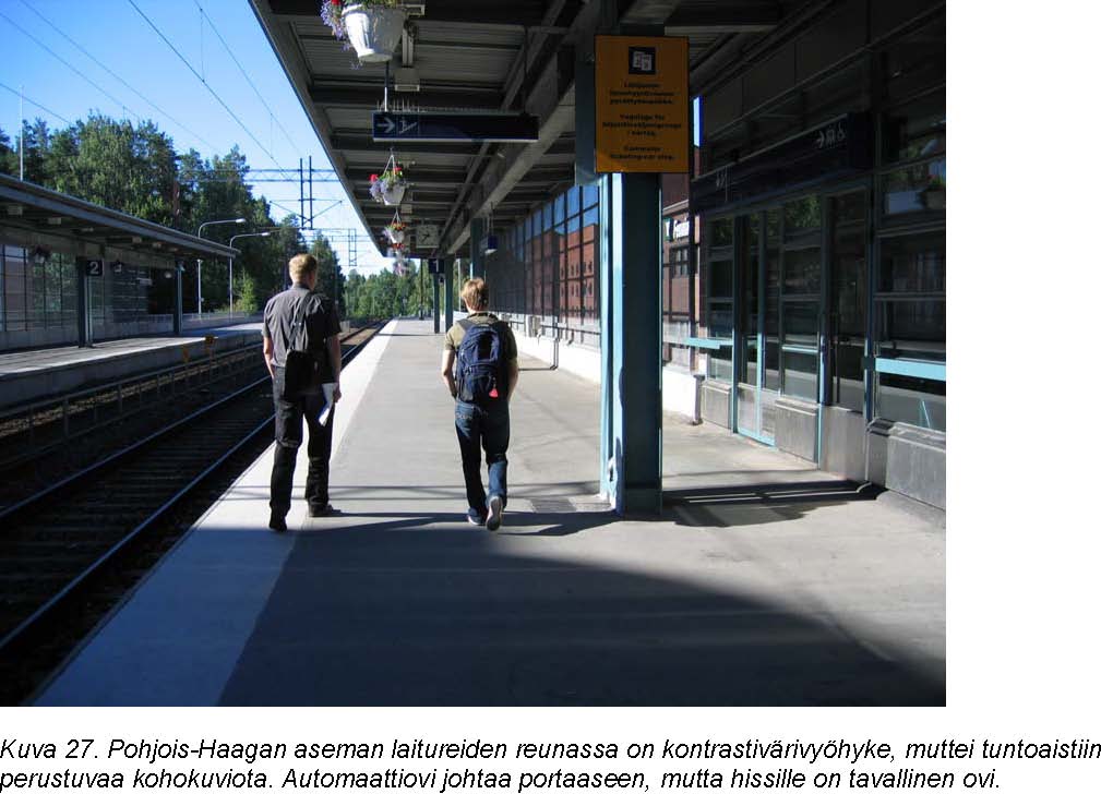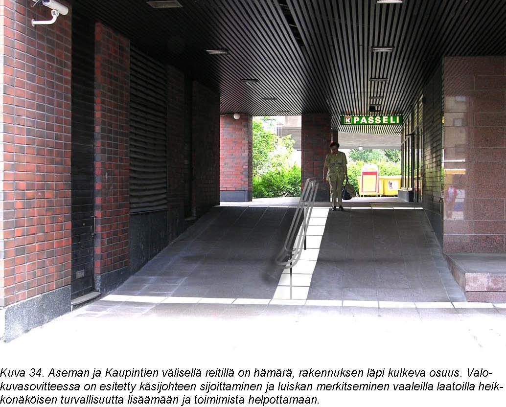 Asemahallin muoto ohjaa kulkemista aika hyvin, mutta ovilta portaille ja hissille ohjaava ”laatta” helpottaisi näkövammaisten liikkumista. Laatta voisi kulkea ovilta oville ja risteytyä sivuille portaitten kohdalla. Seuraavan kerran tämä sivulle kulkeva opaste risteytyisi portaitten alatasolle kohti hissejä ja portaita. Aseman molemmissa portaissa on heikko valaistus. Portaissa ei ole kontrastiraitoja. Lipunosto kioskin tiskille ei pääse pyörätuolilla. Myöskään lippuautomaattia ei pysty käyttämään pyörätuolista.