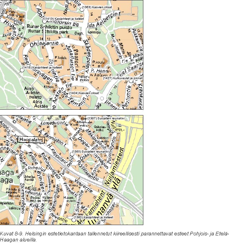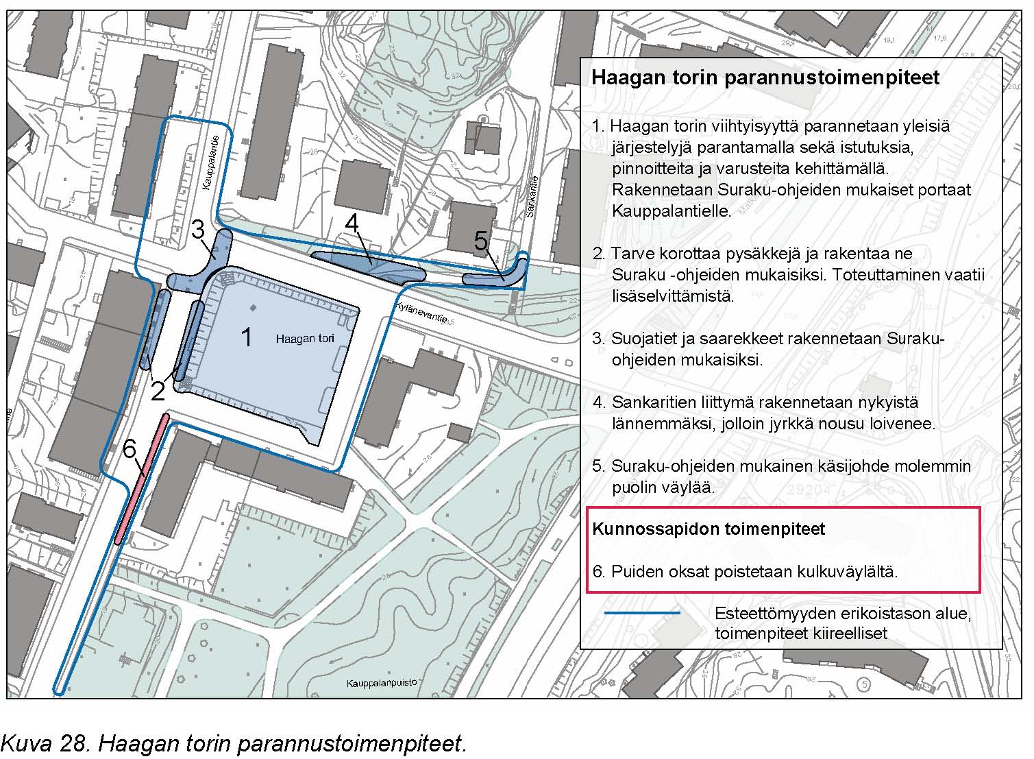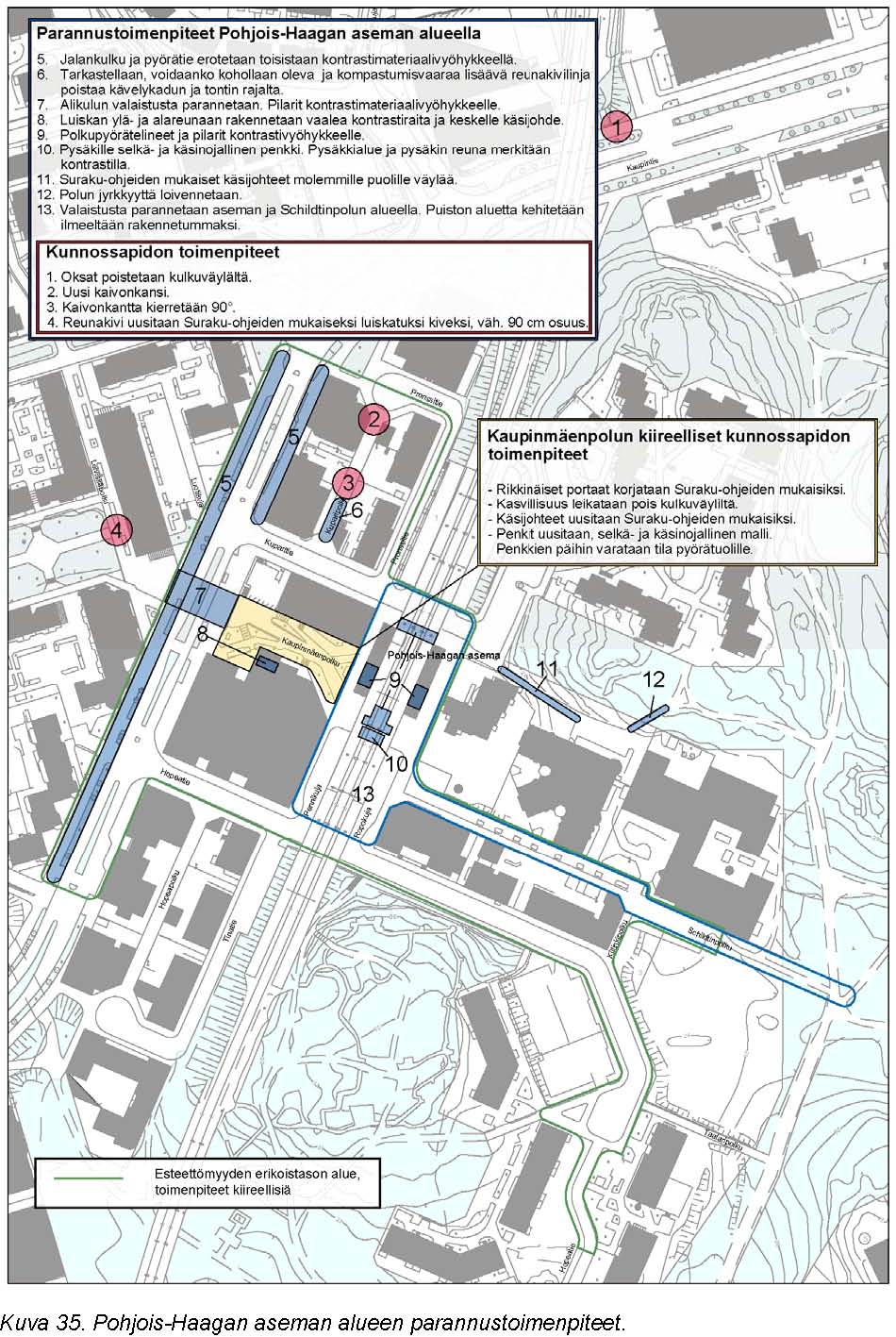 Haagan alueen erilliset esteettömyyden parannustoimenpiteet (sulkeissa raportin kuvan ja toimenpiteiden numerot):