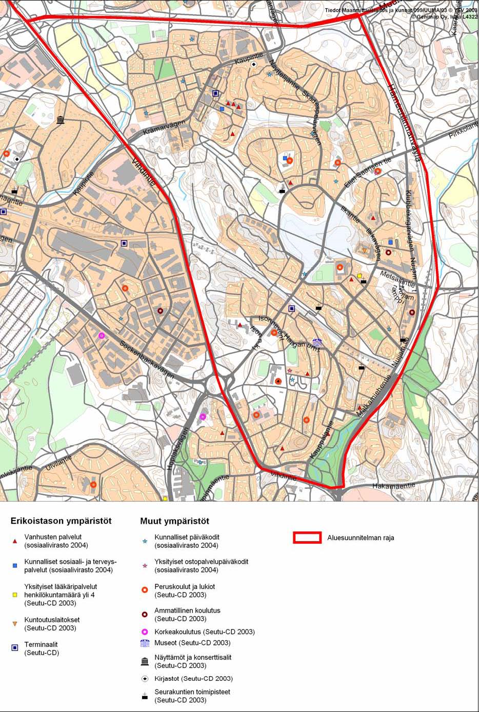 Nykytilanteen arvioinnissa tukeuduttiin lähtökohtaisesti olemassa oleviin paikkatietoaineistoihin: sosiaaliviraston ja kaupunkisuunnitteluviraston tarkennetut aineistot, Helsingin yleiskaavan aineistot sekä SeutuCD. SeutuCD on YTV:n tuottama cd-levy, jolle on koottu pääkaupunkiseudun kuntien keskeiset väestöön ja maankäyttöön liittyvät paikkatiedot yhtenäisessä muodossa. SeutuCD:n tiedot ovat vuoden 2002 lopulta.