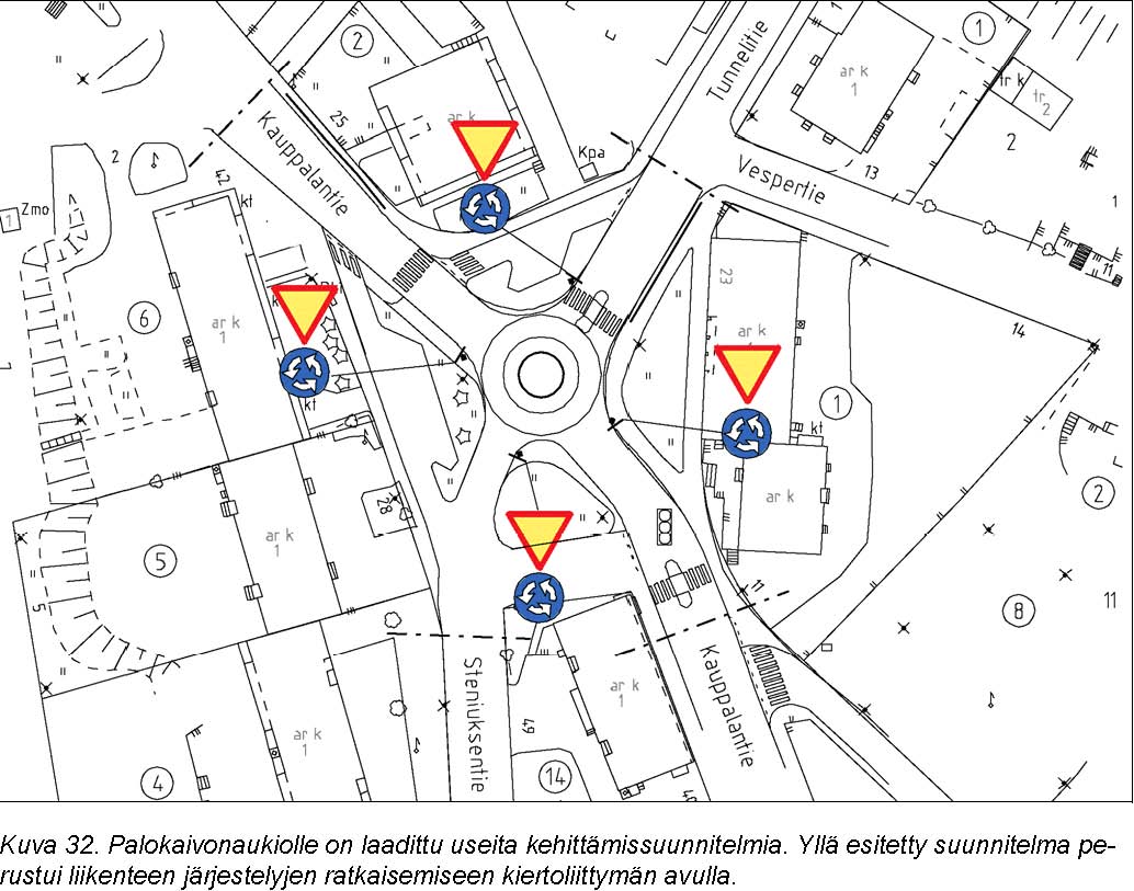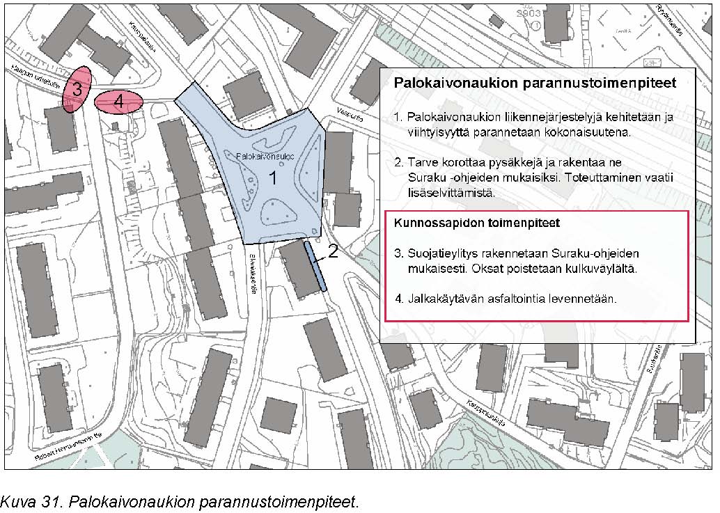Palokaivon aukiolla tulisi korostaa jalankulun ensisijaista asemaa liikennejärjestelyjä, pintamateriaaleja, valaistusta, kalusteita ja varusteita sekä kaupunkikuvaa kehittämällä. Alueelle on laadittu erilaisia vaihtoehtoisia suunnitelmia. Bussiin nousemista helpottaisi, jos Palokaivonaukiolta Kauppalantien suuntaan lähtevää pysäkkiä olisi mahdollista korottaa. Tämä vaatii kuitenkin yksityiskohtaisempaa suunnittelua konkreettisten toimenpiteiden määrittelemiseksi.