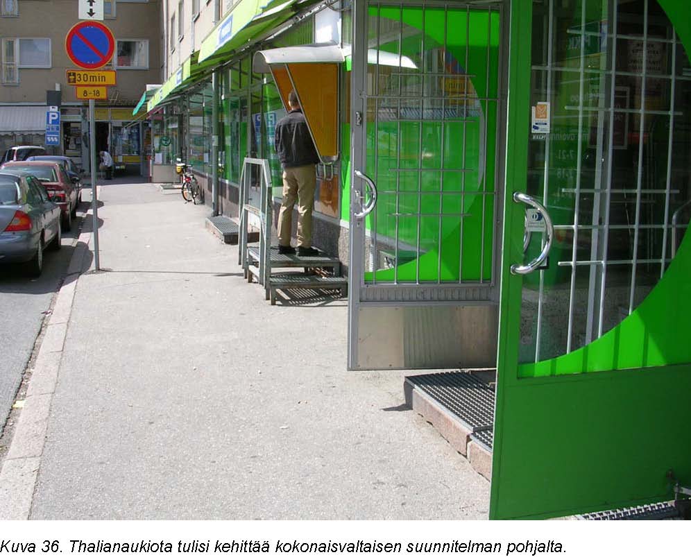 Esteettömyydeltään heikoin ja esteettömyyden parantamisen kannalta tärkein paikka on Thalianaukio. Se on kuitenkin erittäin vaikeasti esteettömäksi parannettava alue. Alueen kehittämistä tulisikin tarkastella kokonaisvaltaisen suunnitelman avulla, jossa kehitetään aukion toimintoja ja liikennejärjestelyjä sekä parannetaan viihtyisyyttä. Käsi- ja selkänojallisia penkkejä ja roska-astioita tarvitaan lisää.