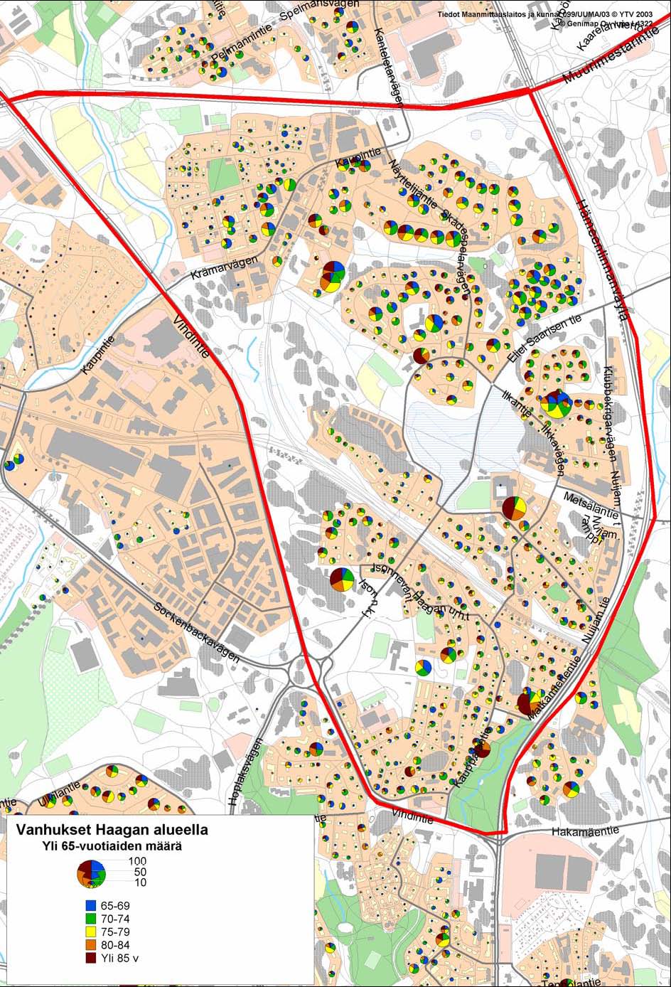 Vanhusten sijoittuminen koko suunnittelualueella tarkasteltiin käyttämällä tietokantana SeutuCD:n tietoja vuoden 2002 lopulta. Vaikka tieto onkin pari vuotta vanhaa, riittää sen tarkkuus tämän suunnitelman tarkasteluihin. Merkittävinä iäkkäiden ihmisten asuinpaikkoina erottuvat alueen vanhainkodit ja palvelutalot, kuten Pohjois-Haagan vanhusten palvelutalot, Riistavuoren vanhustenkeskus, Bertahemmet ja Kristinagården Haagan torin alueella sekä Helander-koti Mäkipellontiellä. Myös valmistumassa oleva Kiinteistö Oy Haagan palvelutalo Ilkantien ja Eliel Saarisen tien kulmassa on otettu huomioon. Pohjois-Haagan alueella näkyy selvästi koko alueen asukkaiden korkea keski-ikä.