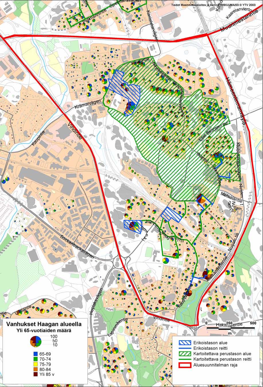 Kuva 4. Kartoitustyötä varten määritellyt erikoistason alueet ja tärkeät perustason alueet ja reitit sekä vanhusten sijoittuminen Haagan alueella.
