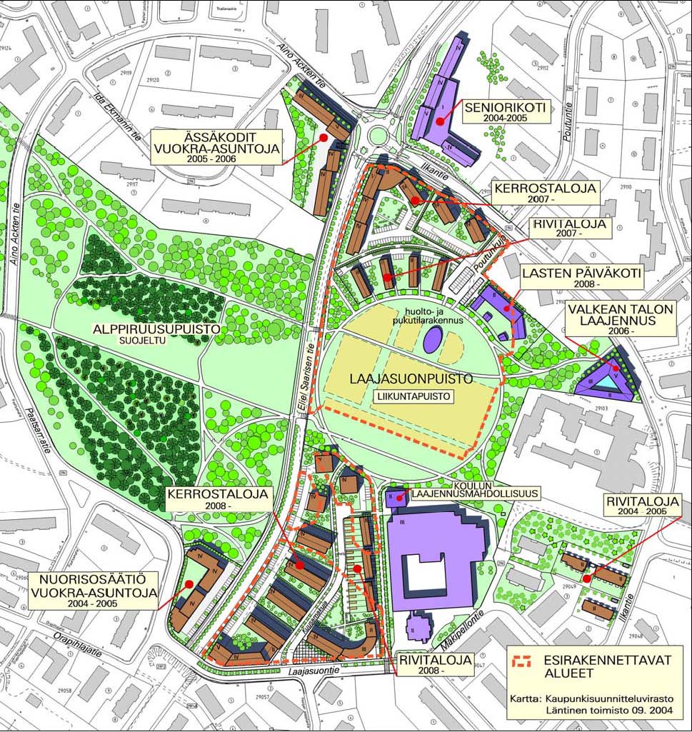 Kuva 5. Ilkantien ja Eliel Saarisen tien liittymään on valmistumassa senioritalo. Myös Ilkantien eteläpuolelle on suunnitteilla ikäihmisille tarkoitettuja asuintaloja. Laajasuonpuisto sijoittuu tasaiselle alueelle, mikä antaa hyvät lähtökohdat esteettömän puiston rakentamiselle. Myös suosittua Alppiruusupuistoa kehitettäessä on esteettömyys perusteltu lähtökohta.