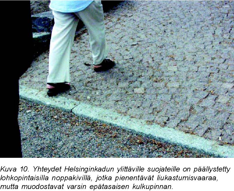 Päällysteen kovuus melko kova œ hieman joustava Päällysteen epätasaisuus poikkisuunnassa on enintään 5 mm / 2 m, pituussuunnassa enintään 10 mm / 3 m, yksittäiset kohoumat enintään 5 mm. Erityistä huomiota tulee kiinnittää kaivonkansiin, jotka eivät saa aiheuttaa yli 5 mm:n epätasaisuutta päällystepintaan. Kaivonkannet, joissa on pitkänomaiset aukot, sijoitetaan niin, että aukot ovat kohtisuoraan kulkusuuntaa vastaan. Ritilät: apuvälineet, esim. valkoinen keppi eivät saa jäädä kiinni rakoihin, maksimileveys 5 mm. Sadevesikaivot sijoitetaan ensisijaisesti kulkupinnan ulkopuolelle. Jos kaivo on kulkupinnalla, siinä pitää olla päällysteen varassa liikkuvat kannet.