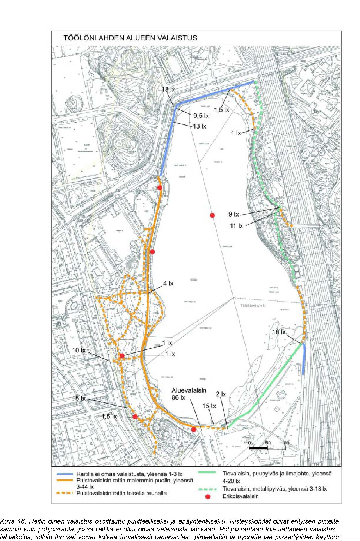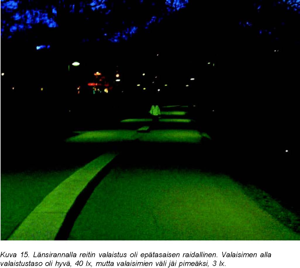 Valoisuus Risteys- ja muutoskohdat ovat hyvin valoisat. Muualla on valaistus, joka antaa turvallisuuden tunteen (valaistuksen alenee vähittäin reitin ulkopuolella, ei pimeitä kohtia, vastaantulijoiden kasvot erottuvat)