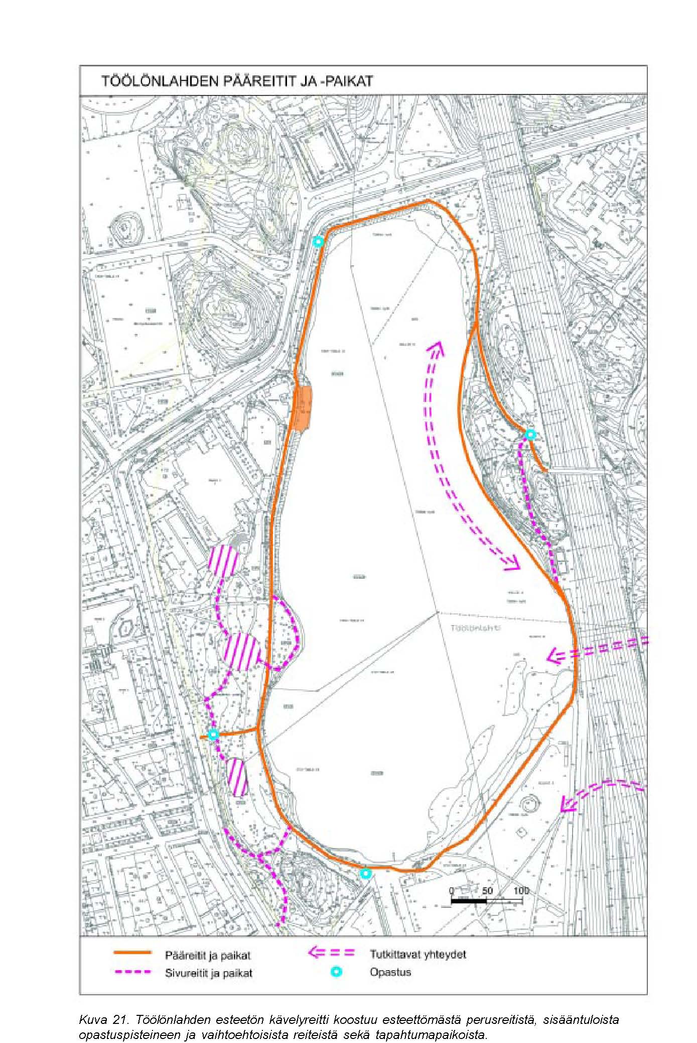 Tämän raportin tarkoituksena on osoittaa ne toimenpiteet, joilla Töölönlahden ympäri kulkeva kävelyreitti voidaan saattaa esteettömäksi. Raportissa esitetään myös yleiset esteettömän puistoreitin kriteerit ja ne toimintatavat, joiden avulla saavutetaan kaikille sopivaa, hyvää ympäristöä. Raportti palvelee rakennuttajaa ja kunnossapitäjää Töölönlahden reittiä parannettaessa. Lisäksi raportti ohjaa myös yleisellä tasolla suunnittelijoita, rakentajia ja kunnossapitäjiä toimimaan niin, että saavutetaan entistä laadukkaampaa, kaikille sopivaa ympäristöä. Usein esteettömyys saavutetaan ilman lisäkustannuksia tekemällä oikeita valintoja ja muuttamalla toimintatapoja.