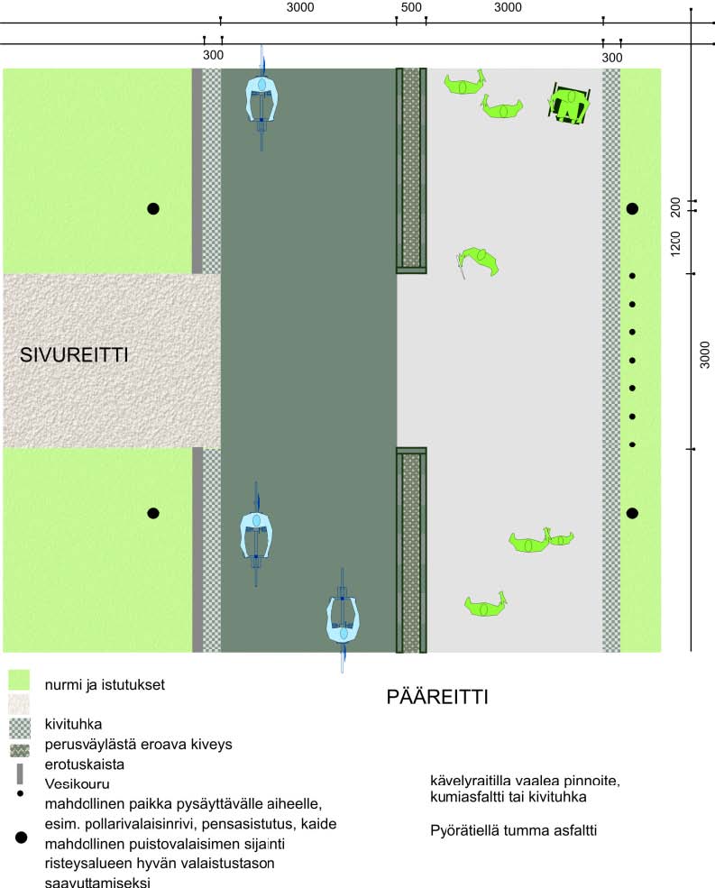 Polkupyörät ja huoltoliikenne Ohjataan eri reiteille. Jos risteyskohtia ei voida välttää, risteykset merkitään ja pyöräilijöiden vauhtia hidastetaan.
