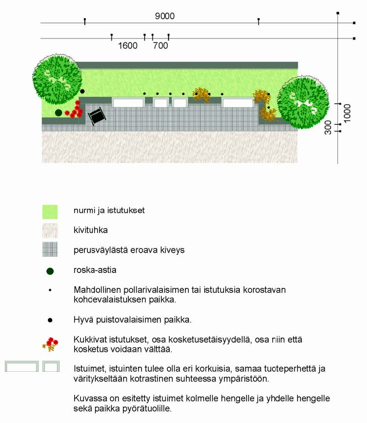 kalusteet 25 m välein). Levähdyspaikat erotetaan polusta poikkeavalla pinta