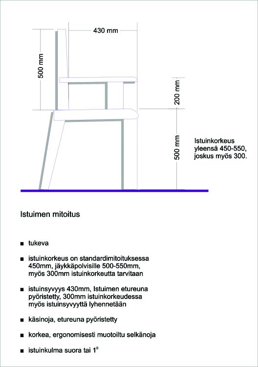 Levähdyspaikalla on yksi tai useampia istuimia. Kalusteiden mitoituksessa otetaan huomioon erityisesti vanhusten tarpeet, kuten riittävän korkea istuin sekä käsituet. Istumakorkeus on tavallisesti 450 mm. Normaalia korkeampi istumakorkeus (500550 mm) on sopiva jäykkäpolvisille ja œlonkkaisille. Lapsille ja lyhytkasvuisille henkilöille sopiva istumakorkeus on 300 mm. Tuki ja liikuntaelin -sairailla on lisäksi omia, tarkempia kriteerejä. Pinnan on oltava kiiltämätön, helposti puhdistettava, kestävä ja se ei saa aiheuttaa allergiaa (esim. nikkeli, kromi, ruoste, kumi). Kalusteissa ei saa olla teräviä särmiä tai kulmia.