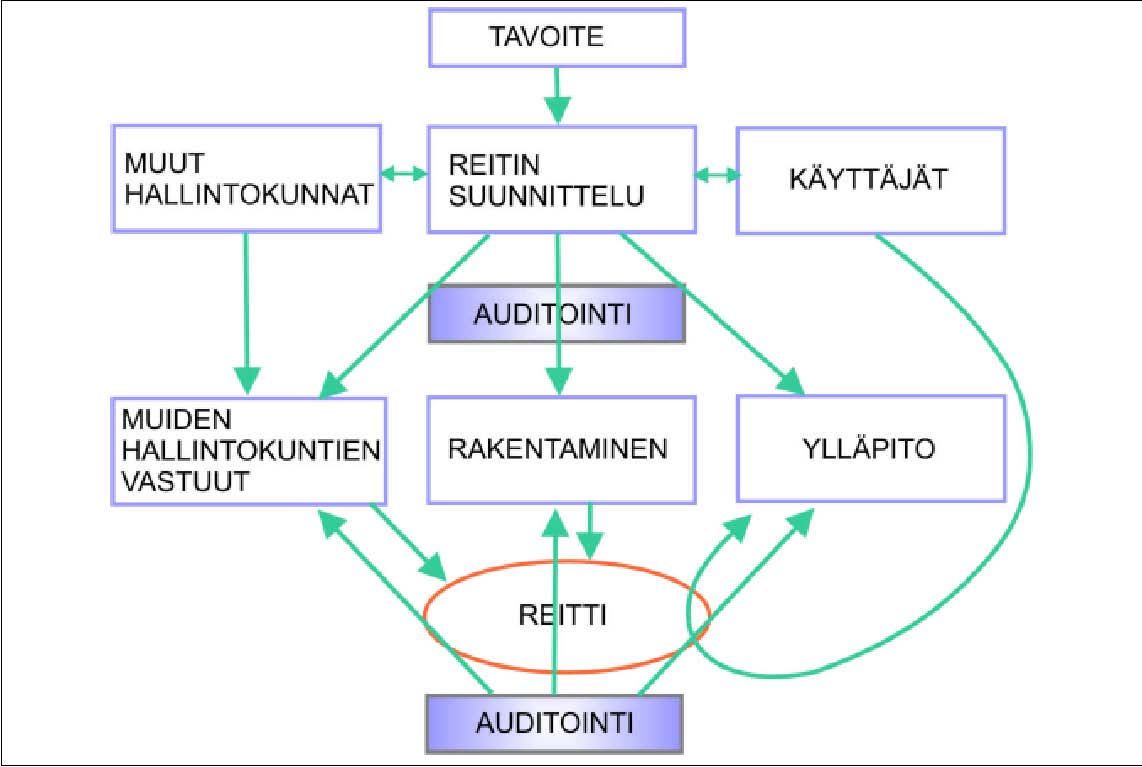 Kuva 1. Esteettömän reitin suunnittelun ja hoidon malli perustuu yhteistyöhön ja säännönmukaiseen auditointijärjestelmään.