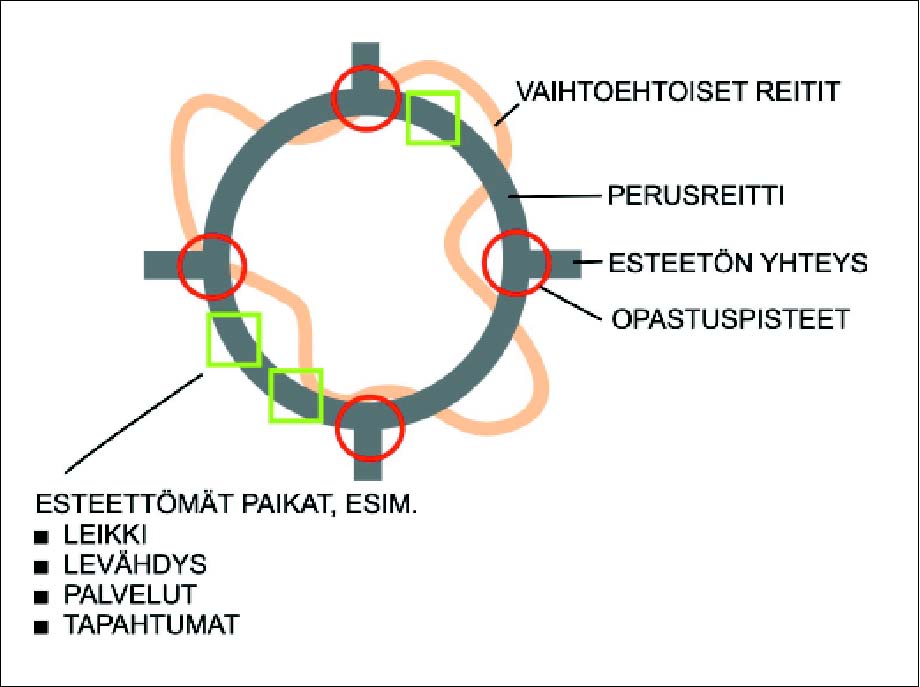 Esteetön reitti muodostuu perusreitistä ja vaihtoehtoisista reiteistä.