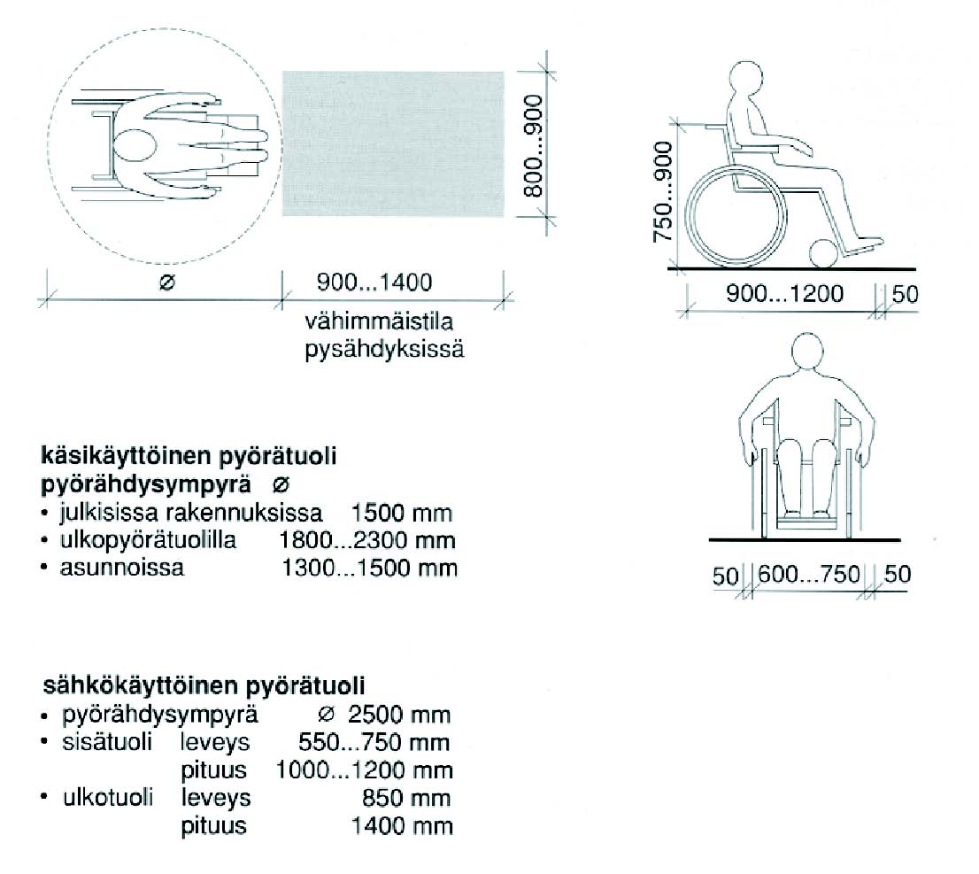 Kuva 3. Pyörätuolin mitat. Pyörätuolissa istuvan naisen katsekorkeus on 1150 mm, miehen 1200 mm. Lasten ulottumiskyky on verrattavissa pyörätuolia käyttävän ulottumiskykyyn. (RT 09-10720)