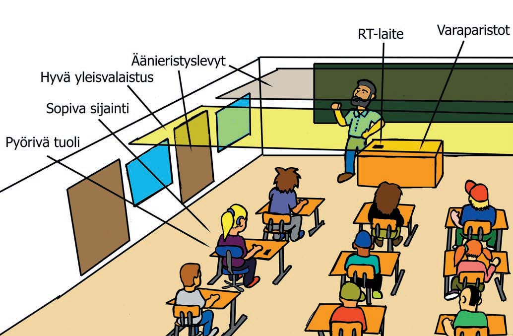 (ei tarvitse kirjoittaa silloin kun opettaja puhuu) • opettaja varmistaa, että huonokuuloinen on kuullut ja ymmärtänyt asian myös meluisissa tilanteissa