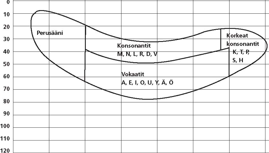 Vokaaleilla on laaja taajuusalue ja suurempi äänenvoimakkuus kuin konsonanteilla. Vokaaleihin verrattuna frikatiiveilla f, h, s ja klusiileilla k, p, t on pienempi äänenvoimakkuus ja taajuusalue sijoittuu yli kolmen tuhannen hertzin. Myös häly sijoittuu samalle taajuusalueelle.
