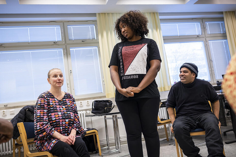 Improvisaatioiden jälkeen ryhmän jäsenet istuvat piirissä ja kertovat tunnelmiaan työväenopiston koulutuksesta.