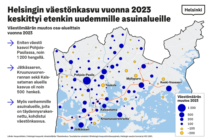 Selvästi eniten asukasmäärä kasvoi Pohjois-Pasilan alueella, jossa lisäys oli noin 1 200 henkeä. Myös muilla alueilla, joille on viime aikoina rakennettu runsaasti asuntoja, asukasmäärä kasvoi paljon – muun muassa Kruunuvuorenrannassa, Jätkäsaaressa sekä Kalasatamassa ja Sompasaaressa asukasmäärä kullakin alueella lisääntyi noin 500 hengellä. Joillakin alueilla asukasmäärä kuitenkin myös väheni vuonna 2023, etenkin Toukolassa, Myllypurossa ja Keski-Vuosaaressa. Näillä alueilla kullakin asukasmäärä väheni noin 200 hengellä.