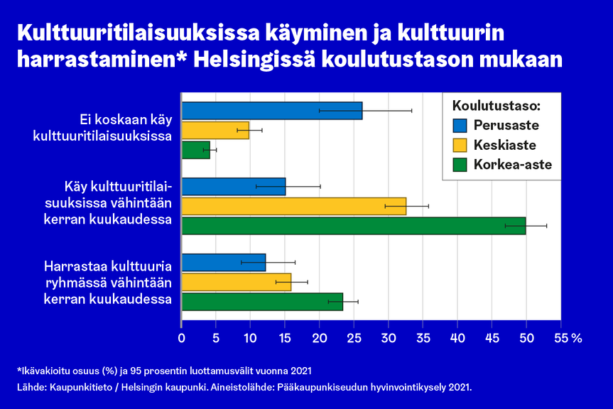 Joka toinen korkea-asteen tutkinnon suorittaneista helsinkiläisistä käy vähintään kerran kuukaudessa taide- tai kulttuuritilaisuudessa tai -tapahtumassa. Perusasteen koulutuksen saaneilla vastaava osuus on 15 prosenttia. Vastaavasti korkeasti koulutetuista helsinkiläisistä vain neljä prosenttia ilmoitti, ettei koskaan käy taide- ja kulttuuritilaisuuksissa tai -tapahtumissa, mutta perusasteen koulutuksen saaneilla vastaava osuus oli 26 prosenttia.