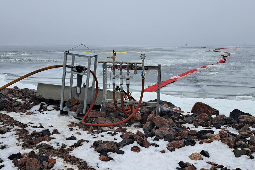 Pienempi kuplaverho oli Hernesaaressa viime talvena testattavana, ja siitä saatiin hyviä käyttökokemuksia. Sen sijaan aiemmin paikalla ollut verhopuomi ei sopinut tuulisen rannan ratkaisuksi.