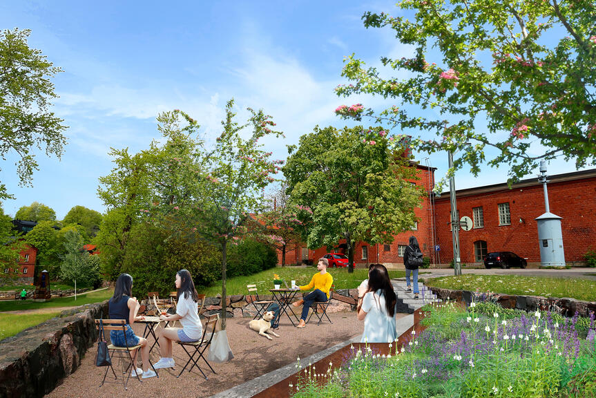 Vanhan kivijalan aukio uusitaan nykyistä vehreämmäksi. Paikalta aukeaa upeat näkymät padolle. Lisäksi saaren etelärannalle rakennetaan uusi oleskelupaikka.