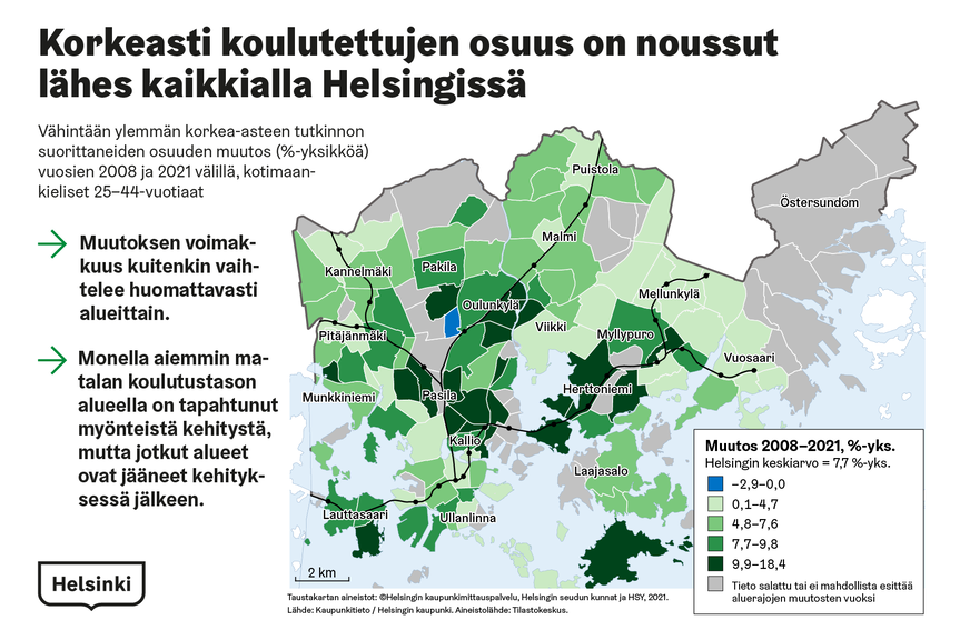 Koulutustason yleisen nousun myötä vailla perusasteen jälkeistä tutkintoa olevien osuus on laskenut kaikkialla Helsingissä. Enintään toisen asteen tutkinnon suorittaneiden osuus on laskenut ja korkeakoulutettujen osuus kasvanut useimmilla alueilla ikäryhmään katsomatta. Etenkin 25–44-vuotiaiden ikäryhmästä yhä harvemmalla helsinkiläisellä on ylimpänä koulutuksenaan toisen asteen tutkinto, sillä nuoret ikäluokat kouluttautuvat yhä useammin toista astetta pidemmälle. Kuitenkin muutosta myös toiseen suuntaan on tapahtunut muutamalla matalimman koulutustason alueella. Näillä alueilla koulutustason nousu on heijastunut enemmänkin toisen asteen tutkintojen yleistymiseen korkeakoulutuksen sijaan, ja tämä näkyy myös nuoremmassa 25–44-vuotiaiden ikäryhmässä.