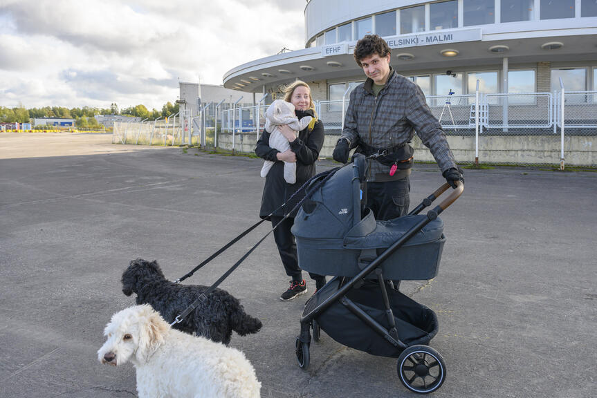 – Onhan tämä valtava! Anne ja Pietari Ranta-aho ovat tulleet vauvan ja koiriensa kanssa Malminkentälle sunnuntaikävelylle.