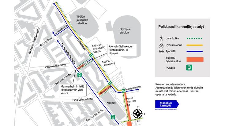 Työn ajaksi Mannerheimintie muuttuu pohjoiseen suuntaan ajettaessa noin 50 metrin matkalta yksikaistaiseksi Sallinkadun risteyksen kohdalla.