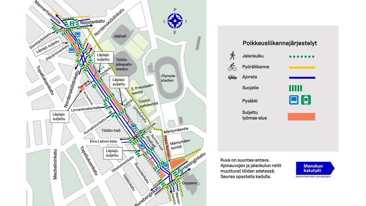 - Jalkakäytävät Mannerheimintien molemmin puolin säilyvät käytössä remontin alkuvaiheessa.