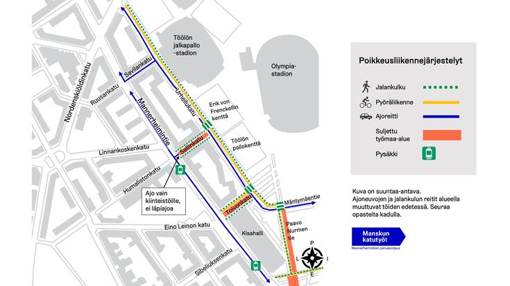 - Huolto- ja tontille ajo säilyy, mutta ajo onnistuu vain Mannerheimintien suunnasta. Myöhemmin huolto- ja tontilleajon suunta muuttuu ja ajo tapahtuu Urheilukadun suunnasta.