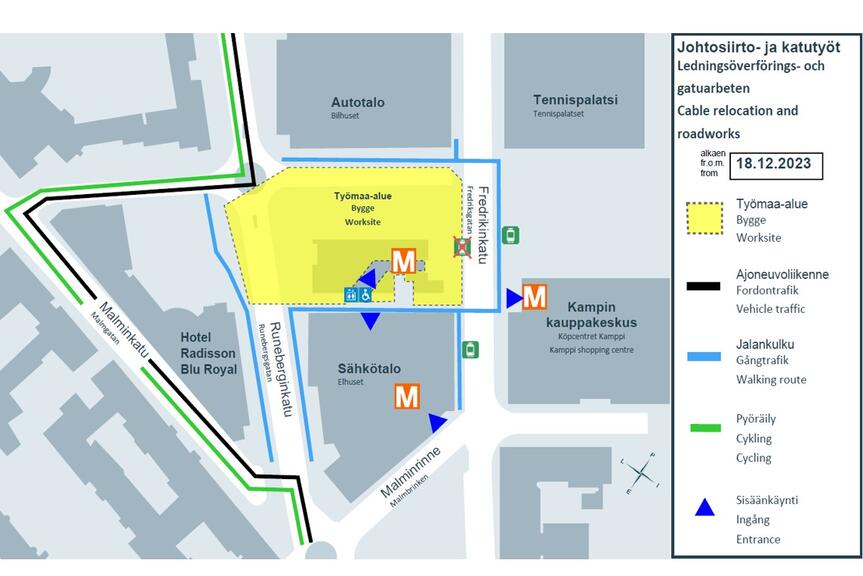 Jalankulkijat ohjataan kulkemaan Fredrikinkadun puolella tien pohjoispuolta eli Kampin kauppakeskuksen puolta pitkin.