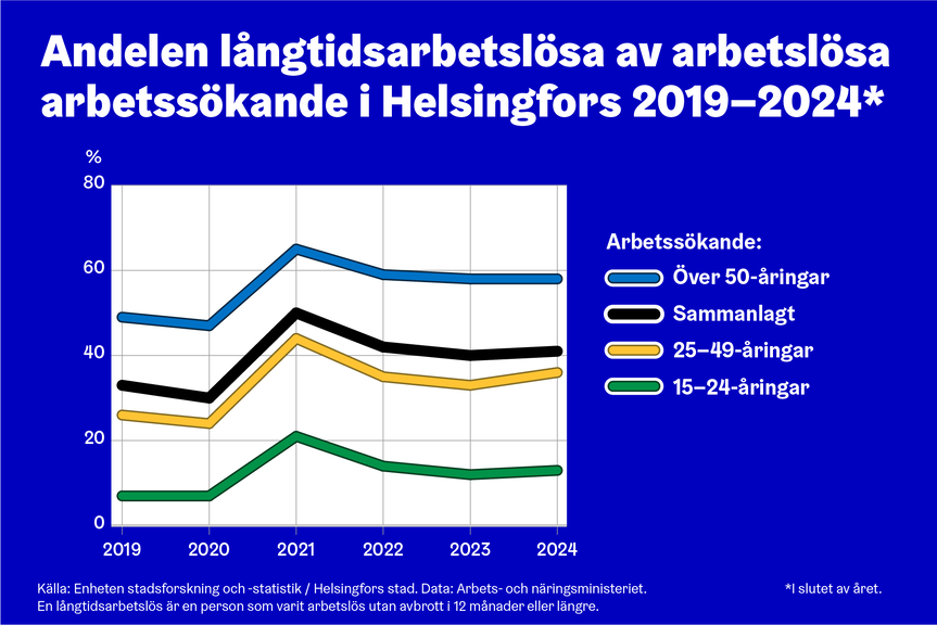 Långtidsarbetslösheten berör alla åldersgrupper, men personer över 50 år är särskilt drabbade. I Helsingfors är mer än varannan arbetslös person över 50 år långtidsarbetslös.