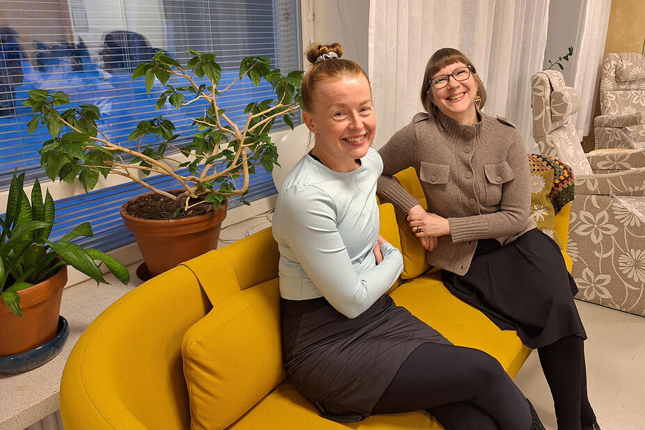 I enkäten var gemenskapskänslan den viktigaste saken som påverkade arbetslivets kvalitet. Det är en styrka även i Gustafsgårds servicecentral. Socialhandledare Tuula Sillanpää och fysioterapeut Jenni Hämäläinen har arbetat där i nästan tjugo år.