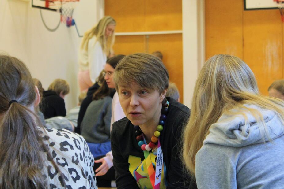 Virve Savoila och Eerika Ströömi, som håller i föreläsningen på uppdrag av människorättsorganisationen Seta, går omkring i salen och diskuterar med eleverna om oskrivna regler och förväntningar som finns på både flickor och pojkar.