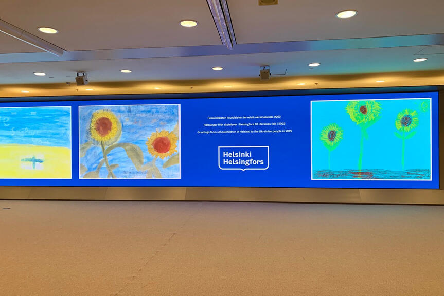 Helsingfors ställde fram hälsningsboken ”We Stand With Ukraine” i centrumbiblioteket Ode i augusti. I boken som riktar sig till det ukrainska folket fick invånarna skriva sina hälsningar under en månad. Samtidigt gjordes det i helsingforsiska skolor teckningar om temat Ukraina. Hälsningsboken och skolbarnens teckningar överlämnades till Ukrainas ambassadör Olga Dibrova i september.