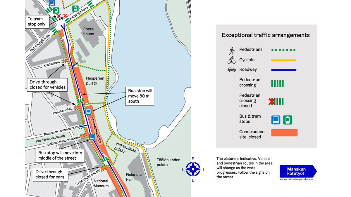- Access from Kivelänkatu and Dunckerinkatu to Mannerheimintie and vice versa will be blocked due to the work at least until the end of the year.