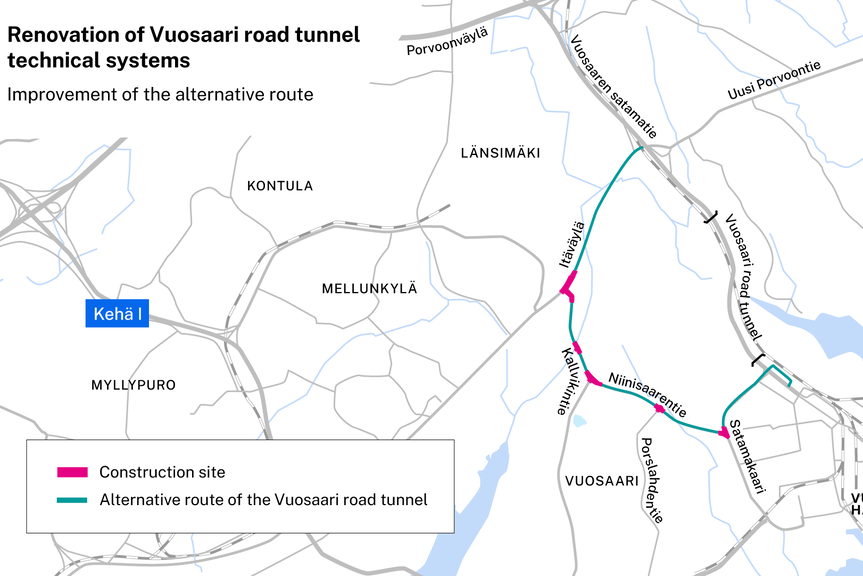 Before the Vuosaari road tunnel renovation in 2025–2026, improvement works will be carried out on the alternative route of the tunnel on the section Itäväylä–Kallvikintie–Niinisaarentie–Vuosaari Harbour. According to the plan, construction work in the tunnel will begin in spring/summer 2025, which will lead the tunnel to be closed for approximately one year. During this period, port and other traffic will primarily be directed to use the tunnel’s alternative route. Normally, the spare route is used during tunnel maintenance and it is also used by special transports.