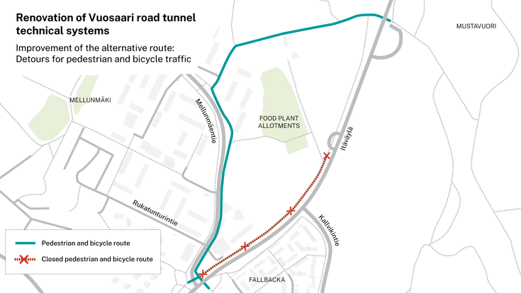 Fintraffic is responsible for the Vuosaari road tunnel's renovation project and for carrying out commissioning improvement work on the alternative route. The City of Helsinki and the Uusimaa ELY Centre will be responsible for planning improvements to the alternative route. The improvement of the alternative route will be implemented by Ylöjärven Kiviset Oy.