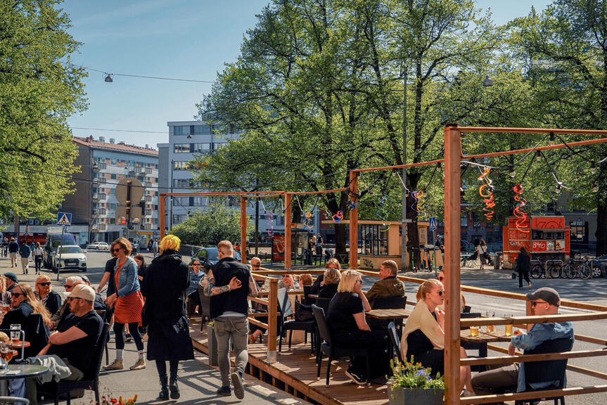 The new seating areas on Porthaninkatu will be constructed in places with raised wooden structures, which were previously used in the Esplanadi trial. Work will also begin in May in the small summer squares in front of Kallio Church, in Torkkelinaukio square, in front of Ympyrätalo and on Kolmas linja.